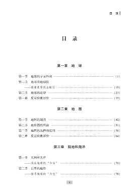 目 录 目 录 第一章 地 球 第一节 地球的宇宙环境 (1) 第二节 地球和地球仪 ———跟着麦哲伦去航行 (15) 第三节 地球的运动 (23) 第一章 质量检测评价 (35) 第二章 地 图 第一节 地图的阅读 (42) 第二节 地形图的判读 (51) 第三节 地图的选择和应用 (58) 第二章 质量检测评价 (64) 第三章 陆地和海洋 第一节 大洲和大洋 ———见证地球的 “今生” (70) 第二节 世界的地形 ———探寻地球的 “今生” (78) 1