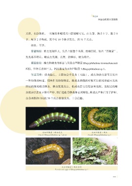 光滑,长纺锤形。一对触角和咀嚼式口器清晰可见。由头部、胸节 3 节、腹节 8
