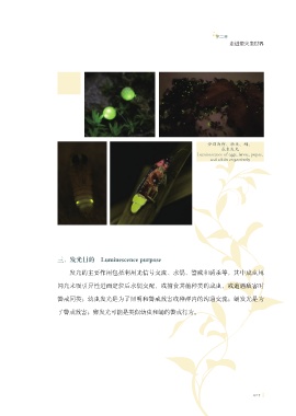 第二章 走进萤火虫世界 分别为卵、幼虫、蛹、 成虫发光 Luminescence of eggs, larvae, pupae, and adults respectively 三、发光目的 Luminescence purpose 发光的主要作用包括利用光信号交流、求偶、警戒和诱杀等,其中成虫用 闪光来吸引异性进而定位后求偶交配,或捕食其他种类的成虫,或遭遇敌害时 警戒同类;幼虫发光是为了照明和警戒敌害或种群内的沟通交流;蛹发光是为 了警戒敌害;卵发光可能是类似幼虫和蛹的警戒行为。 027