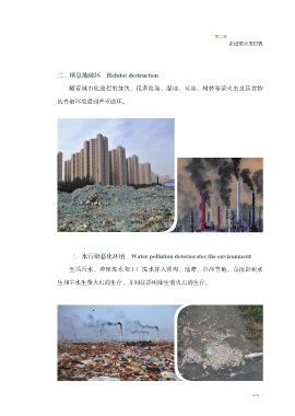 第二章 走进萤火虫世界 二、栖息地破坏 Habitat destruction 随着城市化进程的加快,很多池塘、湿地、荒地、树林等萤火虫及其食物 的喜栖环境遭到严重破坏。 三、水污染恶化环境 Water pollution deteriorates the environment 生活污水、养殖废水和工厂废水排入溪沟、池塘、沼泽等地,直接影响水 生和半水生萤火虫的生存,并间接影响陆生萤火虫的生存。 029