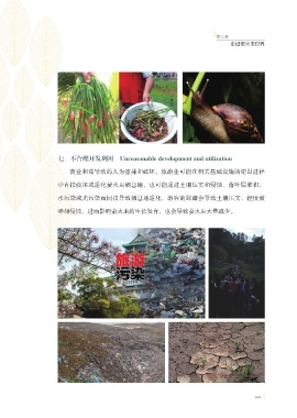第二章 走进萤火虫世界 七、不合理开发利用 Unreasonable development and utilization 商业利益导致的人为滥捕和破坏,旅游业可能在相关基础设施的建设过程 中直接破坏或退化萤火虫栖息地,也可能通过土壤压实和侵蚀、落叶层堆积, 水污染或光污染而间接导致栖息地退化,游客的踩踏会导致土壤压实、轻度破 碎和侵蚀,进而影响萤火虫的生长发育,也会导致萤火虫大量减少。 031