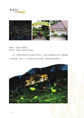 天台山的萤火虫 TOP 6:中国 | 台湾嘉义 TOP 6:China | Chiayi, Taiwan 位于台湾西南的嘉义县是萤火虫的天堂,尤其是素有萤火虫故乡之称的梅 山乡瑞里村,每年 3、4 月是萤火虫的大发生期,成为当地的赏萤季节。 044