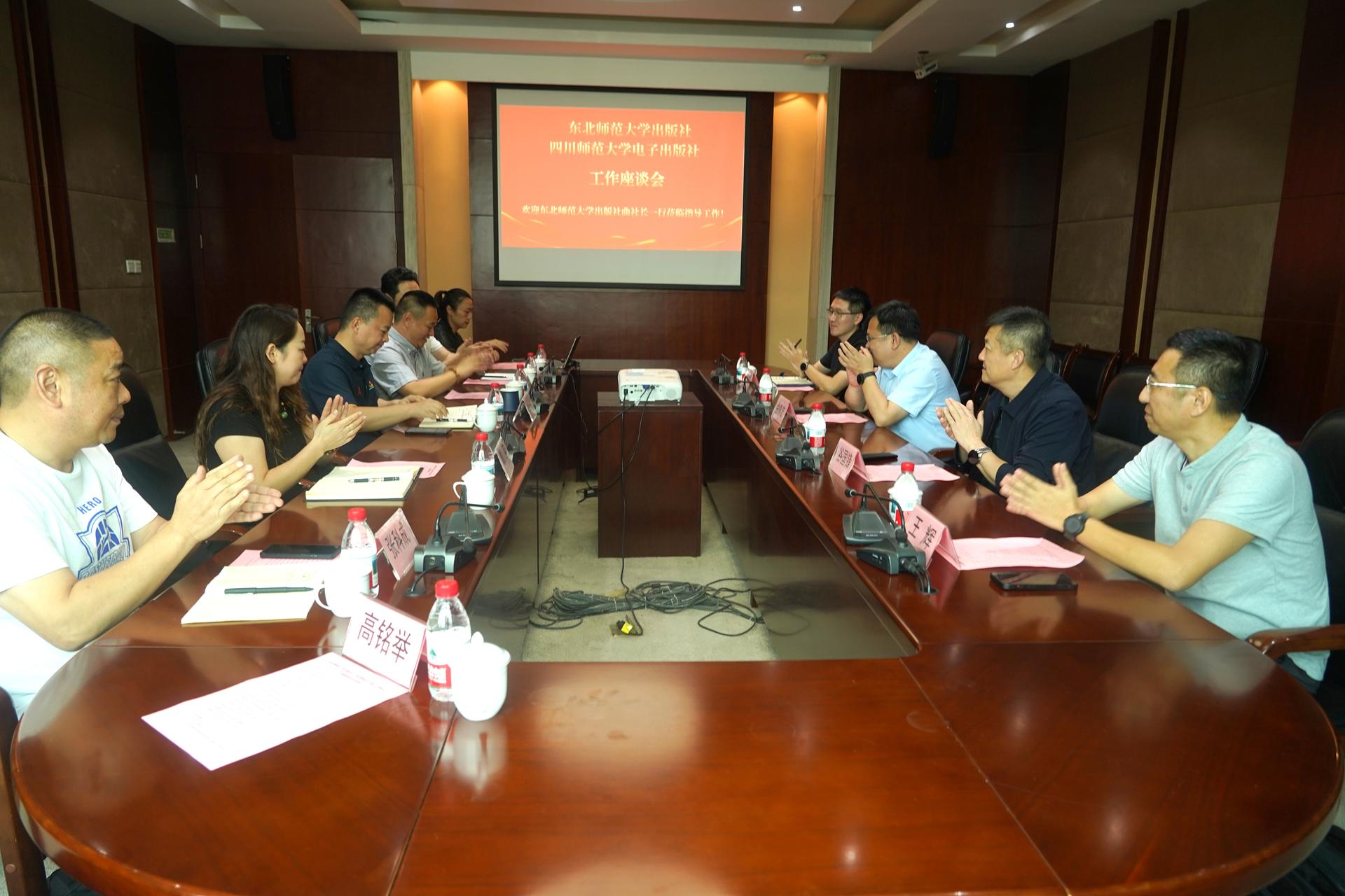 2025年10月17日下午,东北师范大学出版社与四川师范大学电子出版社交流座谈会在四川师大教育发展集团第一会议室举行。东北师范大学出版社社长曲春波、书记谷国锋,四川师大教育发展集团党委副书记、总经理毕小超,副总经理、电子出版社社长卿捷等主要领导齐聚一堂,共话出版高质量发展,共谋深度合作新篇。东北师范大学出版社业务经理许冰、学思公司总经理王辉,教发集团办公室副主任戴莉,电子出版社邓方成、张科成、胡丽娜、高铭举等参与座谈。会议由卿捷主持。